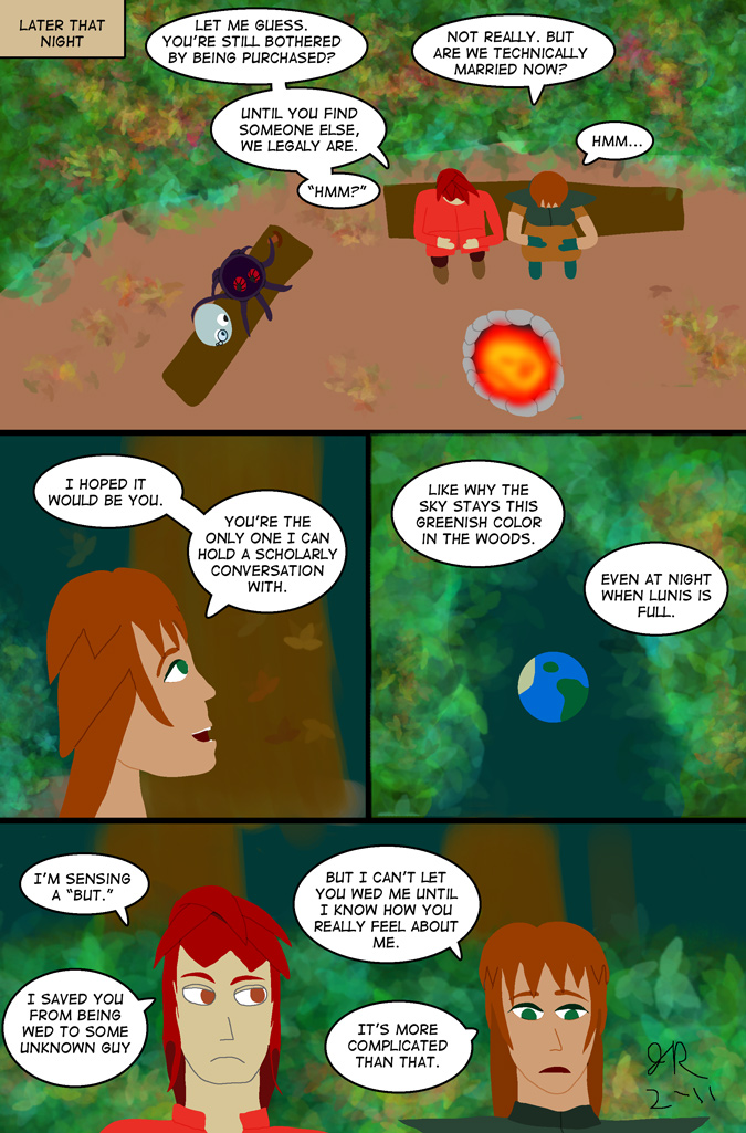 More talk in a more foresty-looking forest (thanks to some brushes I found here. It might be a little hard to see, but Ophelia is holding a mushroom in her tentacle (yes, the creepy-looking thing that looks like it could eat your brains is a vegetarian).